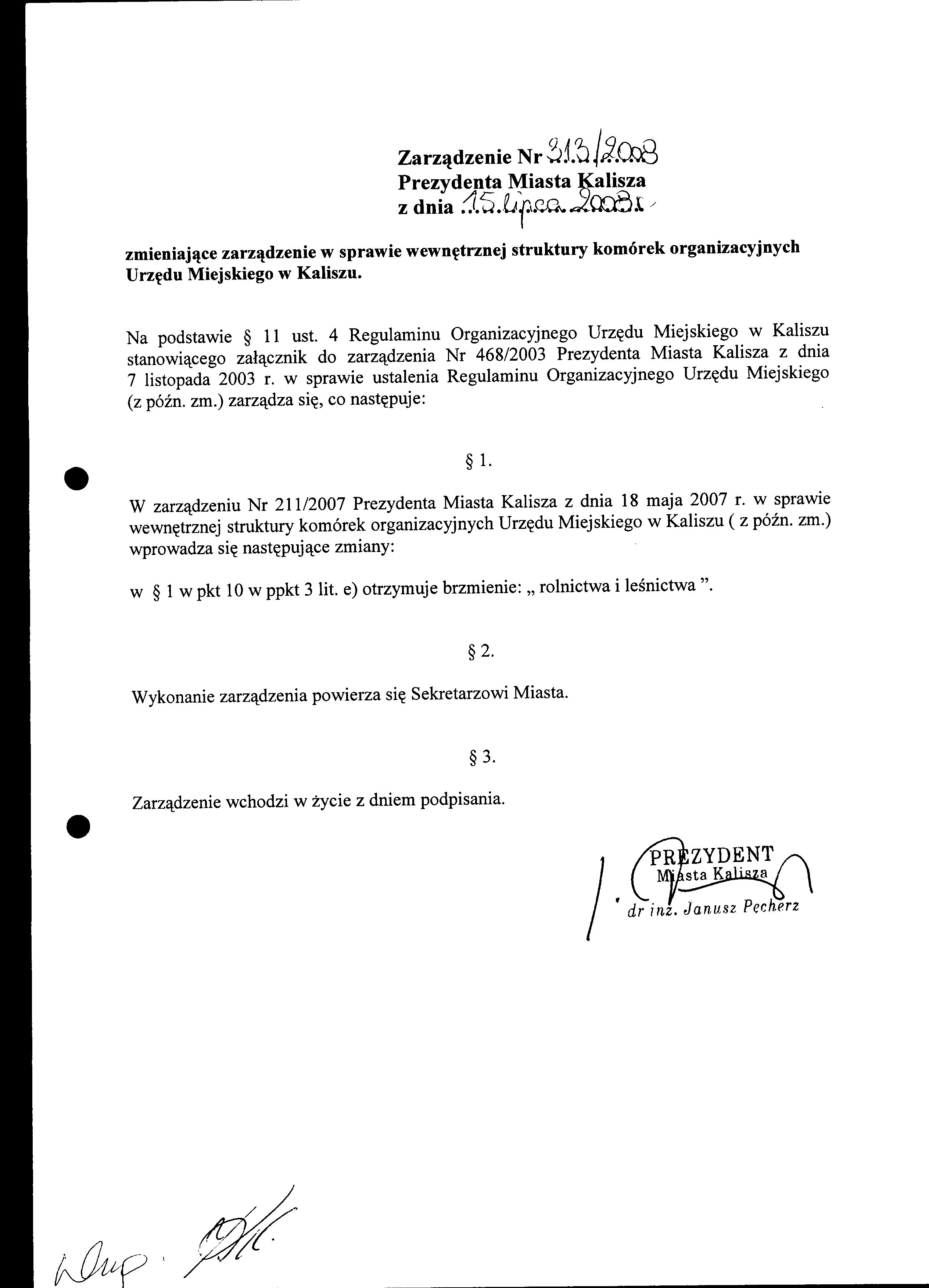 211.Zarządzenie Nr 307/2008 Prezydenta Miasta Kalisza z dnia 14 lipca 2008r. w sprawie wyrażenia zgody na likwidację środków trwałych – dzierżawionych przez Przedsiębiorstwo Energetyki Cieplnej S.A. w Kaliszu.